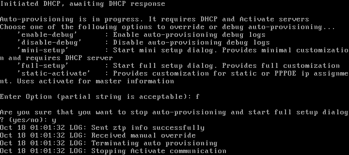 Teraz następuje próba automatycznego wdrażania konfiguracji, która wymaga poprawnie skonfigurowanego serwera DHCP i dostępu do ustawień w Aruba Activate. W tym momencie należy nacisnąć klawiszFlub wpisaćfull-setupi nacisnąć Enter w celu przeprowadzenia ręcznej konfiguracji. Następnie naciśnij klawiszYlub wpiszyesi naciśnij Enter w celu potwierdzenia chęci ręcznego podania wszystkich wymaganych informacji.