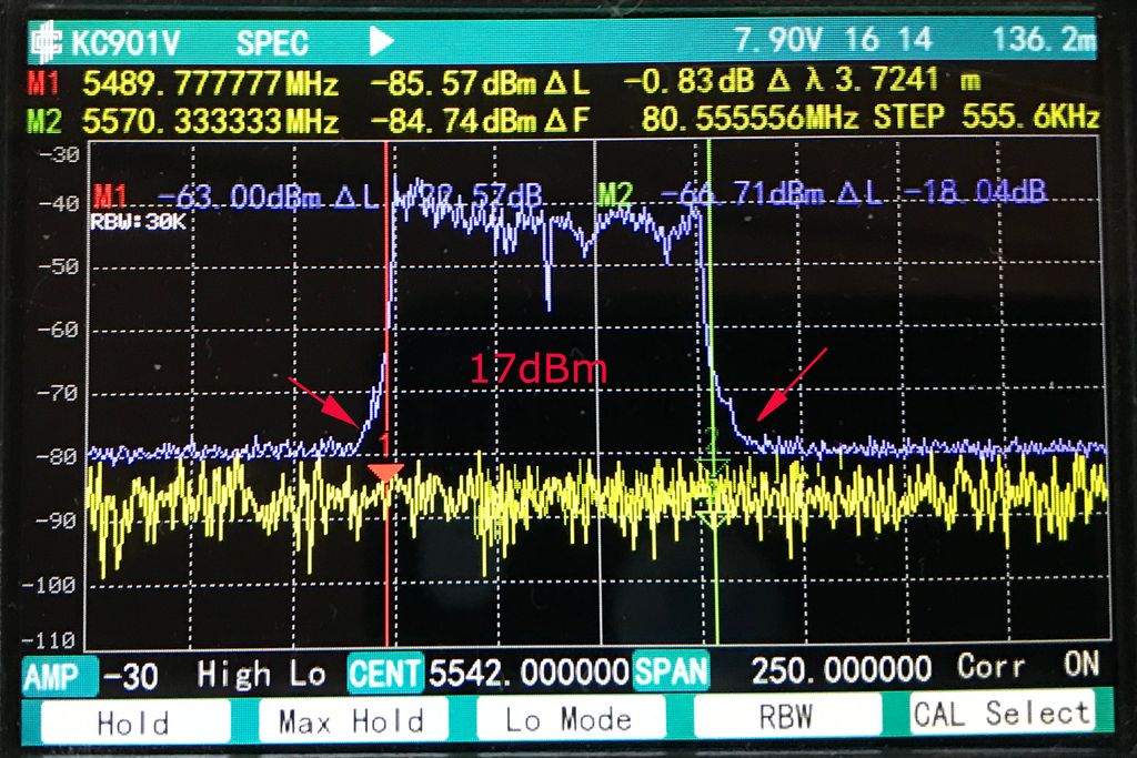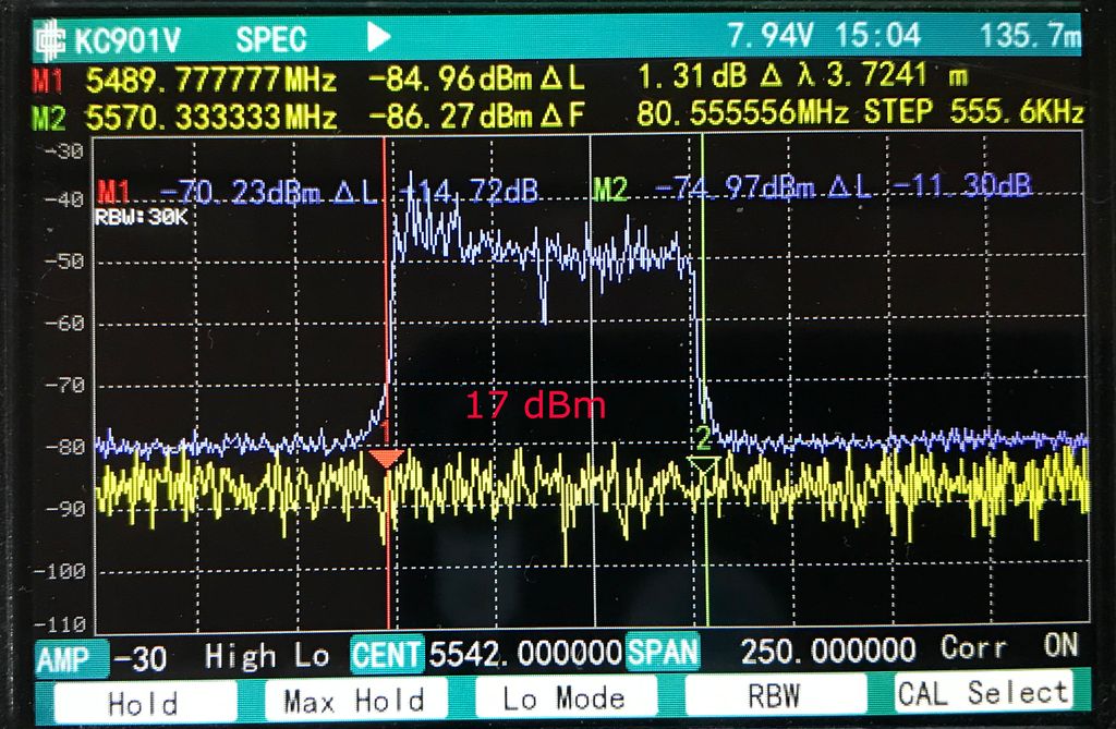 Po zwiększeniu mocy jedynie do 30 dBm (+13 dBm) widać tylko nieznacznie zwiększenie mocy nadajnika ale za to powstają bardzo duże zakłócenia na sąsiednich kanałach.