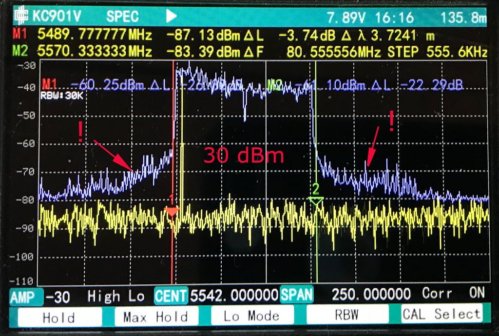 Natomiast po zwiększeniu mocy nadajnika tylko do 30 dBm, moc nadawcza faktycznie wzrosła (ale raczej nie o +13 dBm), ale za to uzyskaliśmy bardzo duże zakłócenia na sąsiednich kanałach.
