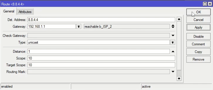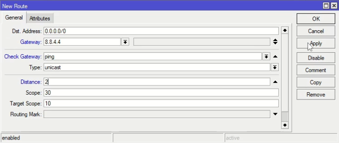add distance=1 dst-address=8.8.8.8 gateway=xxx.xxx.xxx.xxx scope=10 target-scope=30