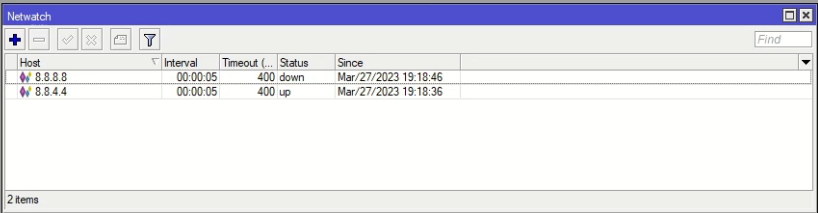 Teraz użyjemy narzędzia Netwatch, by przełączanie nastąpiło po zdefiniowanym czasie. Przechodzimy do zakładki Tools > Netwatch i znakiem plusa dodajemy nową rubryke. Uzupełniamy pola