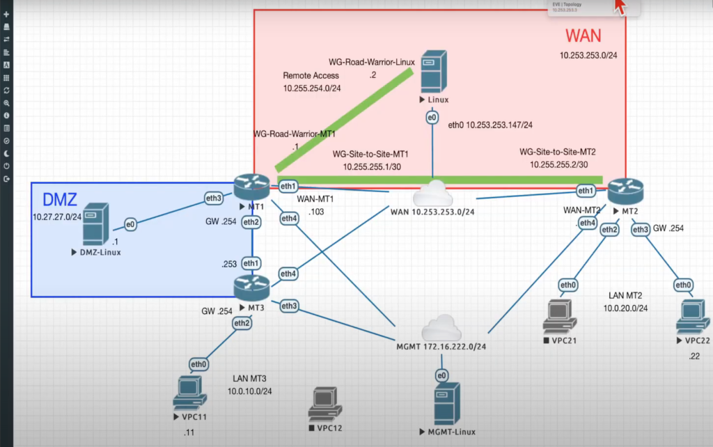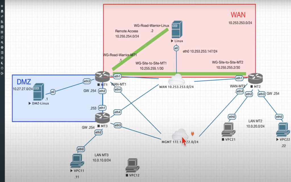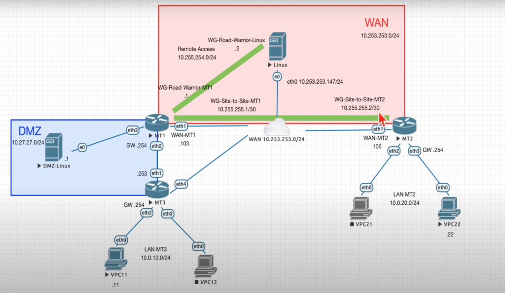 Powyżej widzimy na czerwono oznaczoną strefę WAN, na niebiesko natomiast strefę DMZ. W strefie DMZ znajduje się jeden serwer LINUXowy, który podłączony jest do mikrotika (MT1).