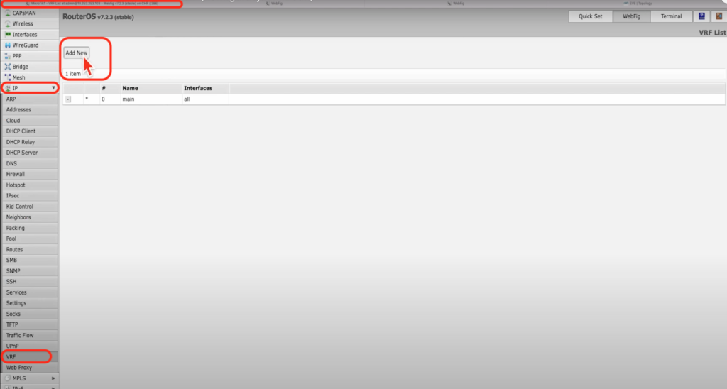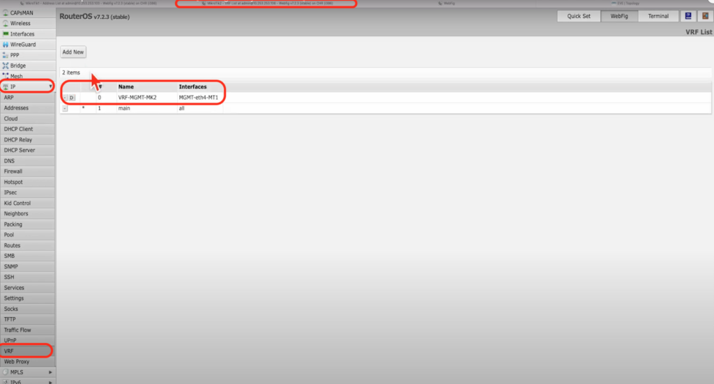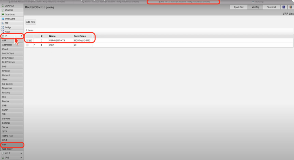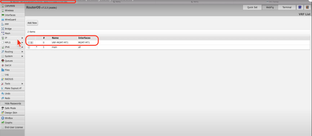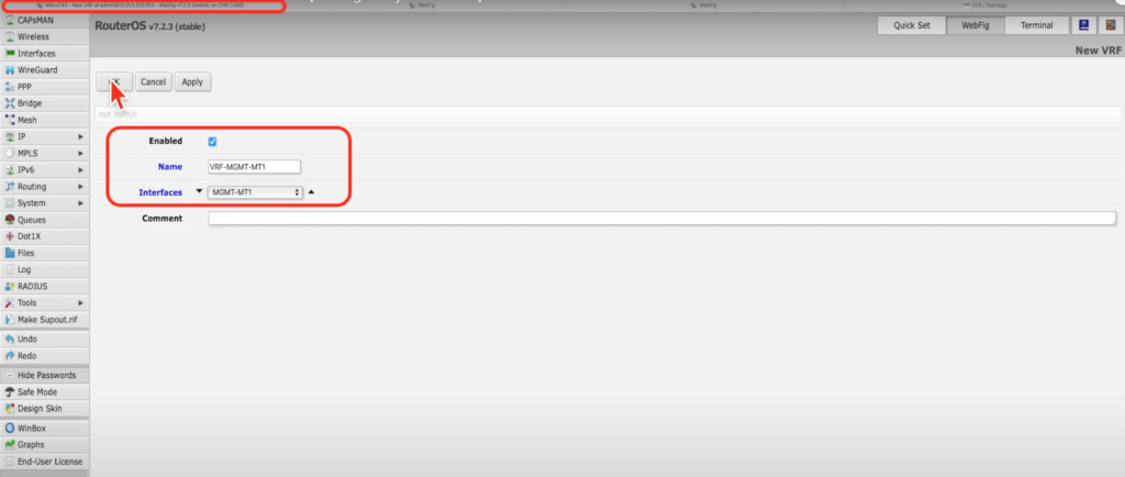 Dodawanie nowego VRF na MT1 – nadanie nazwy i wybór interface’u