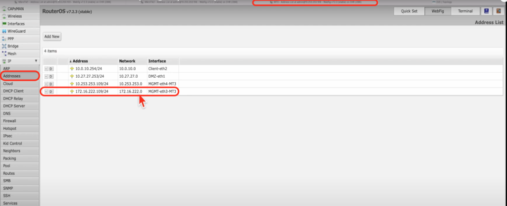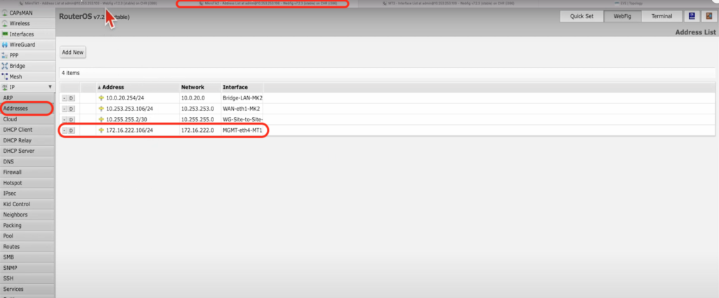 Kolejnym krokiem jest skonfigurowanie osobnej tablicy routingu dla sieci zarządzania MGMT 172.16.222.0/24 na każdym z naszych mikrotików.