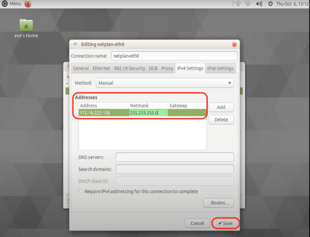 Adres IP ustalamy tu statycznie na 172.16.222.130, maska 24 bity, bez GW i bez DNS.