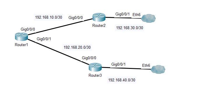 Router1 Router1(config) #int gig0/0/0 Router1(config-if) # no shutdown Router1(config-if) #ip add 192.168.10.1 255.255.255.252 Router1(config-if) #end Router1(config) #int gig0/0/1 Router1(config-if) # no shutdown Router1(config-if) #ip add 192.168.20.1 255.255.255.252