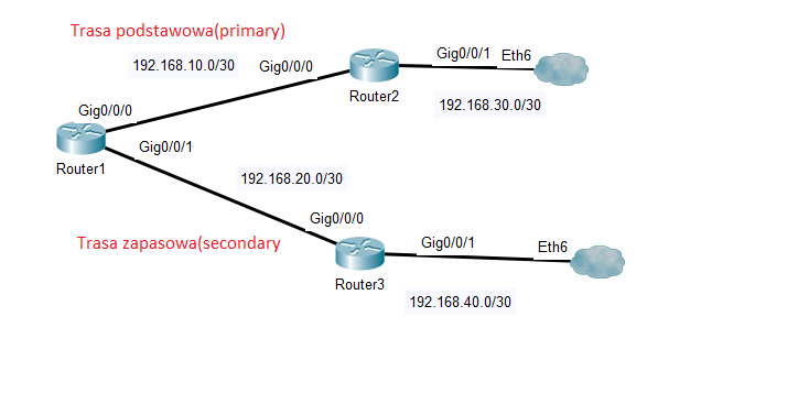 Do skonfigurowania IP SLA posłuży powyższa topologia, która składa się z trzech Routerów
