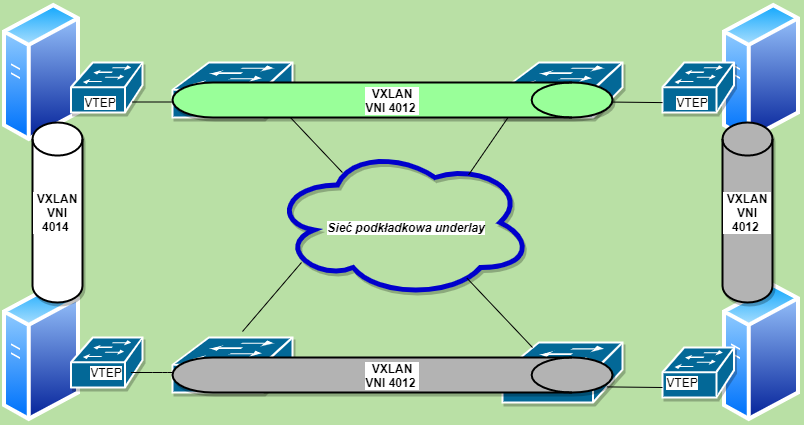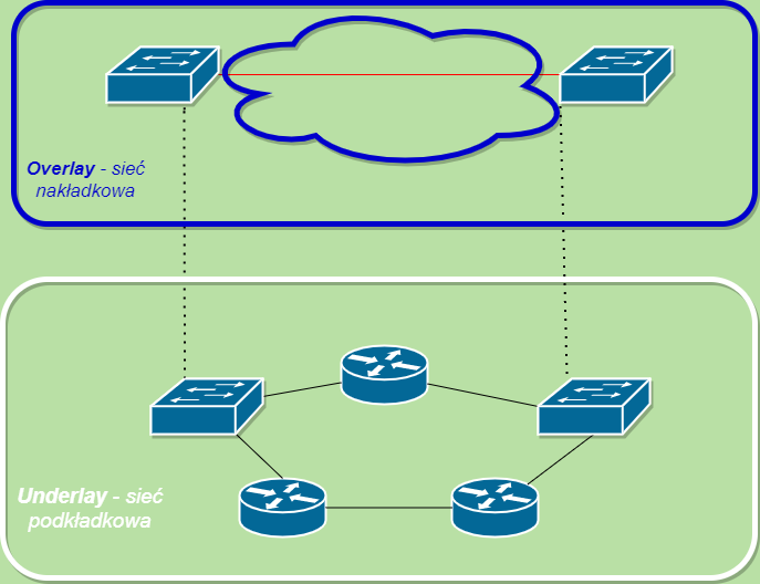 Sieć overlay – określa się jako sieć wirtualna, która działa na górze fizycznej sieci bazowej. Dość powszechnym przykładem sieci overlay(sieci nakładkowej) jest tunel GRE. Właśnie tunel GREprzebiega nad fizyczną siecią underlay(podkładkowa). Mając na uwadze VXLAN overlay(sieć nakładkowa) odnosi się do sieci Ethernet warstwy 2. Natomiast underlay(sieć podkładkowa) odnosi się do sieci IP warstwy 3