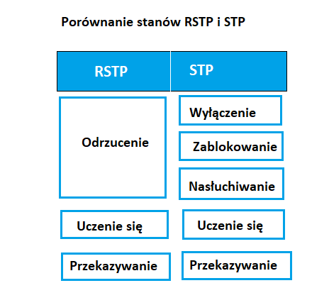 Jeśli chodzi o RSTP następuje pominięcie dwóch stanów jakie znajdują się w STP – chodzi oczywiście o stan blokowania oraz nasłuchiwania. Kiedy Rapid Spanning Tree Protocol będzie po stanie odrzucenia, automatycznie przejdzie do stanu przesyłania. Poniższy rysunek odzwierciedla porównanie stanów RSTP i STP.