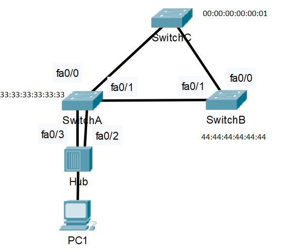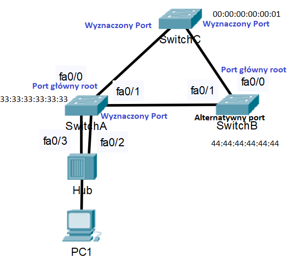 Dwa porty połączone z hubem składają się z jednego wyznaczonego portu dla każdego segmentu(porty fa0/2 oraz f0/3 na SwitchuA znajdują się w tym samym segmencie z tego powodu, że są podłączone do huba).