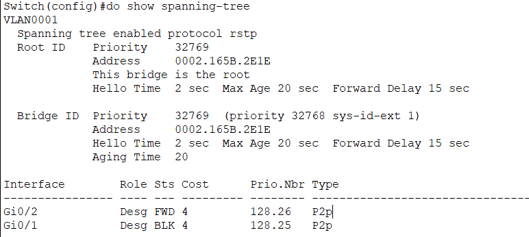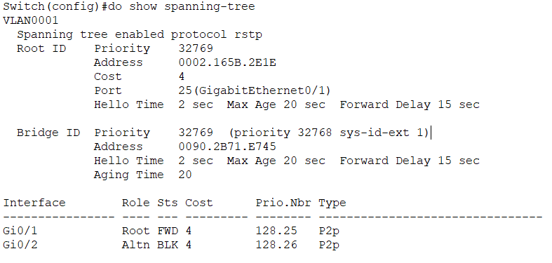 SwitchA Switch>en Switch#conf t Enter configuration commands, one per line. End with CNTL/Z. Switch(config)#interface vlan 1 Switch(config-if)#ip add Switch(config-if)#ip address 192.168.100.1 255.255.255.0 Switch(config-if)#spanning-tree mode rapid-pvst Switch(config)#do show spanning-tree