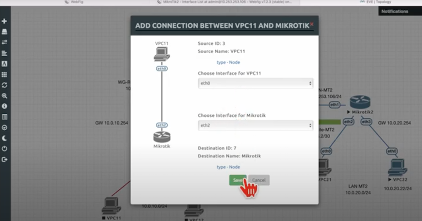 W tym momencie przechodzimy do ustawienia adresu IP na eth2 MT3, czyli GW dla VPC11.