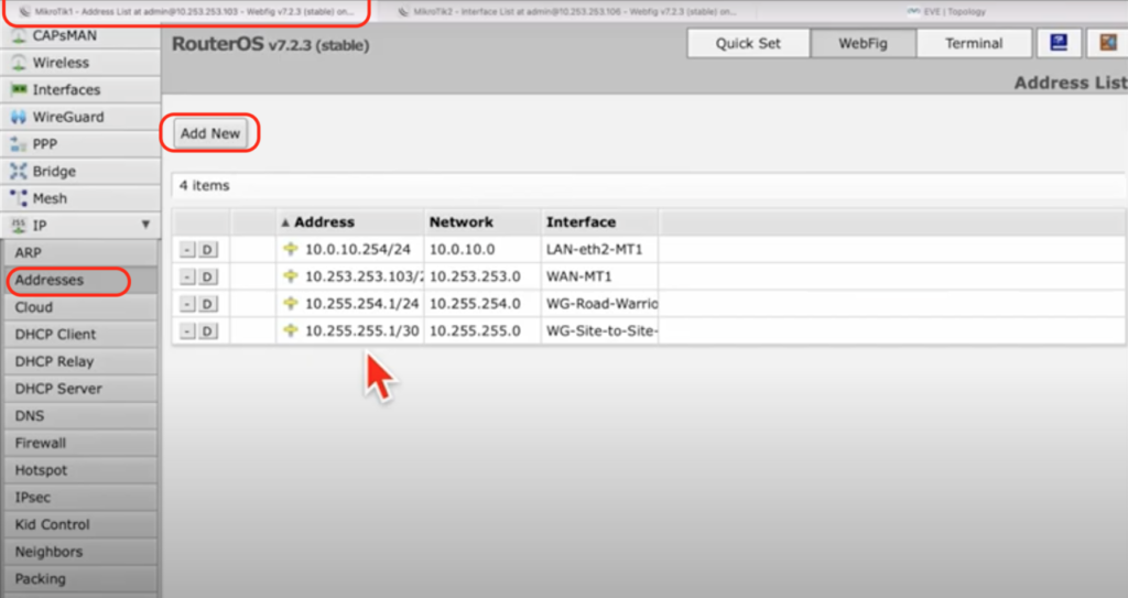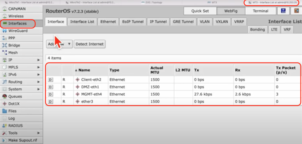 Tym razem, ze względów technicznych, w naszym przykładzie podłączenie Mikrotika 3 do sieci zarządzania będzie zrealizowane przez dodatkowy interface eth4 podłączony do sieci 10.253.253.0.