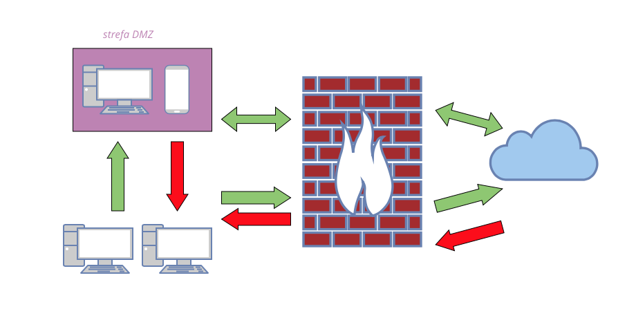 Na powyższym schemacie mamy już uwzględnioną naszą strefę DMZ (to ta ramka w kolorze fioletowym).
