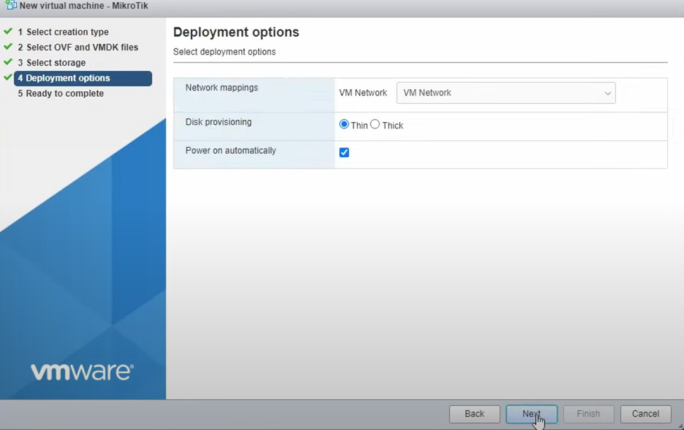 Następnie nasz pobrany szablon mikrotika musimy zaimportować. Wystarczy, że w menu VMware wybierzemy Virtual Machine, a następnie w okienku Select creation type wybierzemy Deploy a virtual machine from az OVF or OVA file
