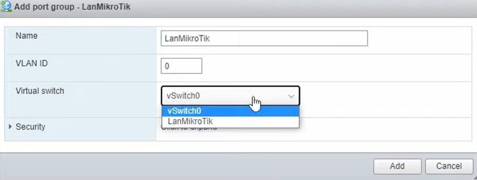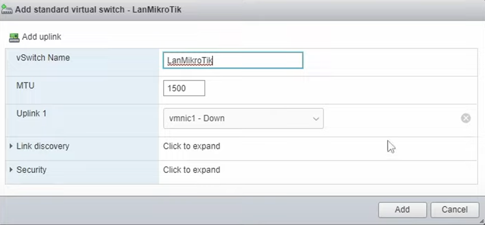vSwitch Name – dobrą praktyką jest nazwanie switcha w taki sposób, abyśmy wiedzieli do czego go wykorzystujemy. Jeżeli nie używamy VLANów to zachęcam do pisania tutaj krótkiego opisu. W moim przypadku będzie to LanMikroTik, ponieważ pod tym będą kryły się moje połączenia LAN-owe z Mikrotikiem.