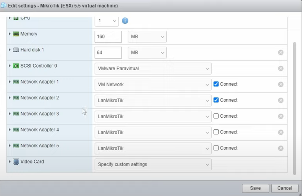 Najważniejsze jest aby w tym momencie zwrócić uwagę na Connect, potocznie oznacza to, że nasz wirtualny kabel sieciowy jest podłączony. Zostawiamy tyle kabli ile potrzebujemy, w naszym wypadku będą to dwa pierwsze, czyli pierwsze dwa porty w naszym Mikrotiku będą zajęte.