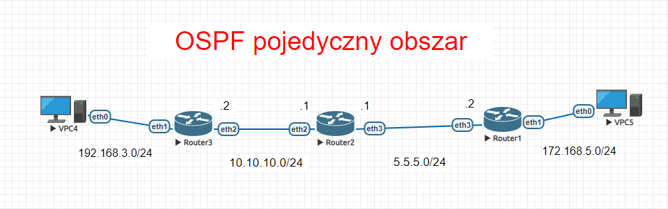 Na każdym routerze musimy zapropagować jego sieci, każda będzie należeć do jednego i tego samego obszaru (który posiada również to samo ID)