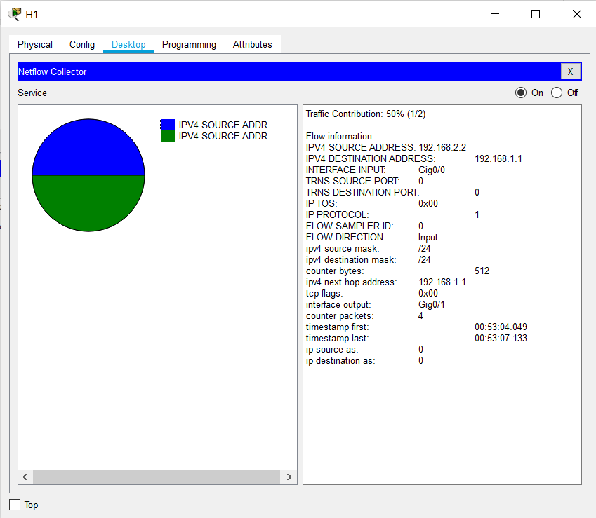 Router>en Router#conf t Enter configuration commands, one per line. End with CNTL/Z. Router(config)#ip flow-export destination 192.168.2.2 9996 Router(config)#ip flow-export version 9 Router(config)#interface gigabitEthernet 0/0 Router(config-if)#ip flow ingress Router(config-if)#int g0/1 Router(config-if)#ip flow egress