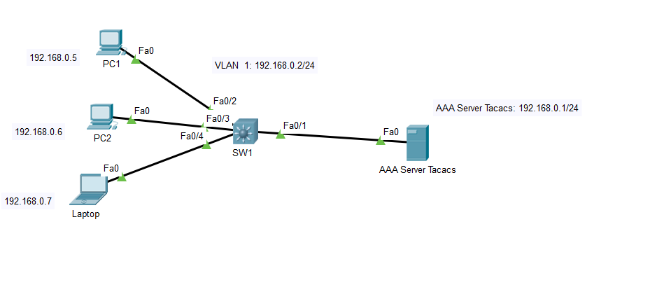 SW1(config)#tacacs-server host 192.168.0.1 key xyz