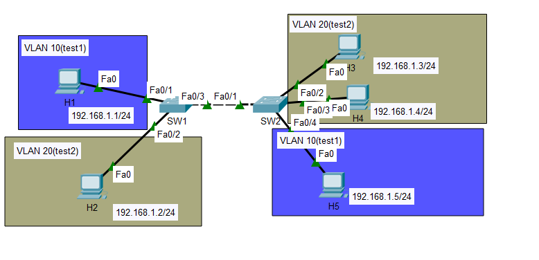 SW1: Switch>en Switch#conf t Enter configuration commands, one per line. End with CNTL/Z. Switch(config)#vlan 10 Switch(config-vlan)#name test1 Switch(config-vlan)#exit Switch(config)#vlan 20 Switch(config-vlan)#name test2 Switch(config-vlan)#exit Switch(config)#do show vlan brief VLAN Name Status Ports ---- -------------------------------- --------- ------------------------------- 1 default active Fa0/1, Fa0/2, Fa0/3, Fa0/4 Fa0/5, Fa0/6, Fa0/7, Fa0/8 Fa0/9, Fa0/10, Fa0/11, Fa0/12 Fa0/13, Fa0/14, Fa0/15, Fa0/16 Fa0/17, Fa0/18, Fa0/19, Fa0/20 Fa0/21, Fa0/22, Fa0/23, Fa0/24 Gig0/1, Gig0/2 10 test1 active 20 test2 active 1002 fddi-default active 1003 token-ring-default active 1004 fddinet-default active 1005 trnet-default active Switch(config)#interface fastEthernet 0/1 Switch(config-if)#switchport mode access Switch(config-if)#switchport access vlan 10 Switch(config-if)#exit Switch(config)#interface fastEthernet 0/2 Switch(config-if)#switchport mode access Switch(config-if)#switchport access vlan 20 Switch(config-if)#do show vlan brief VLAN Name Status Ports ---- -------------------------------- --------- ------------------------------- 1 default active Fa0/3, Fa0/4, Fa0/5, Fa0/6 Fa0/7, Fa0/8, Fa0/9, Fa0/10 Fa0/11, Fa0/12, Fa0/13, Fa0/14 Fa0/15, Fa0/16, Fa0/17, Fa0/18 Fa0/19, Fa0/20, Fa0/21, Fa0/22 Fa0/23, Fa0/24, Gig0/1, Gig0/2 10 test1 active Fa0/1 20 test2 active Fa0/2 1002 fddi-default active 1003 token-ring-default active 1004 fddinet-default active 1005 trnet-default active Switch(config-if)#exit Switch(config)#interface fastEthernet 0/3 Switch(config-if)#switchport mode trunk