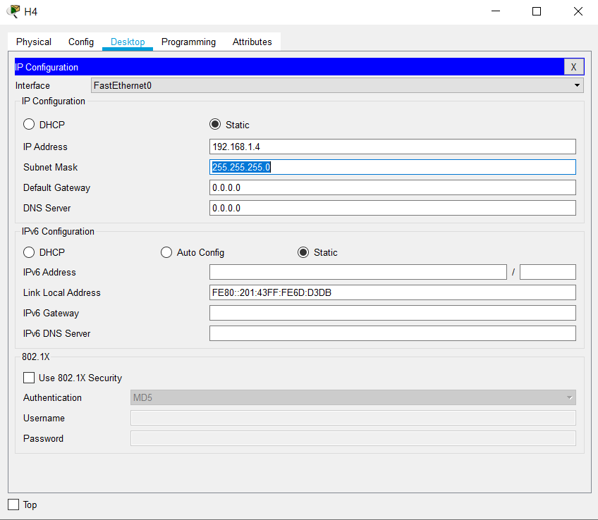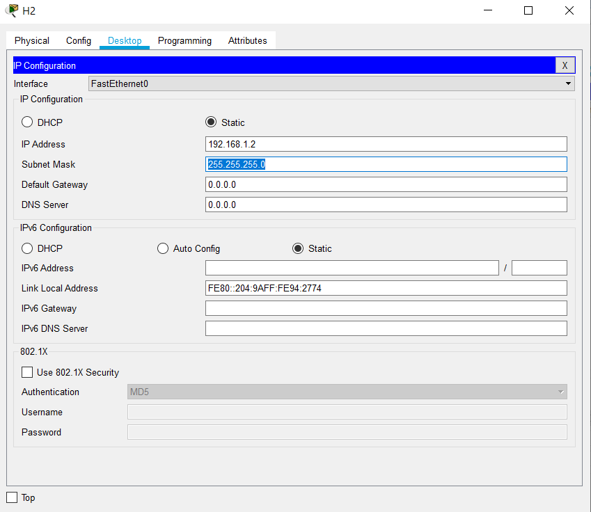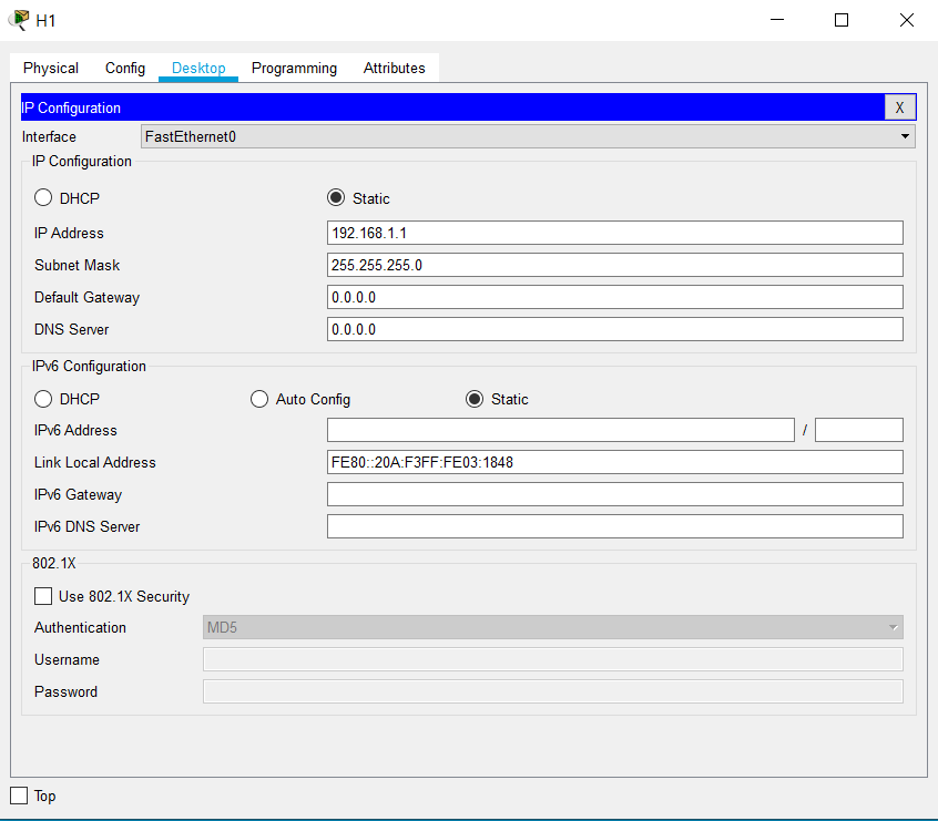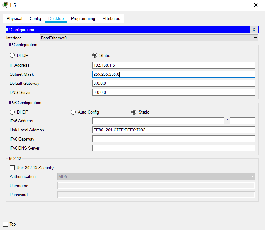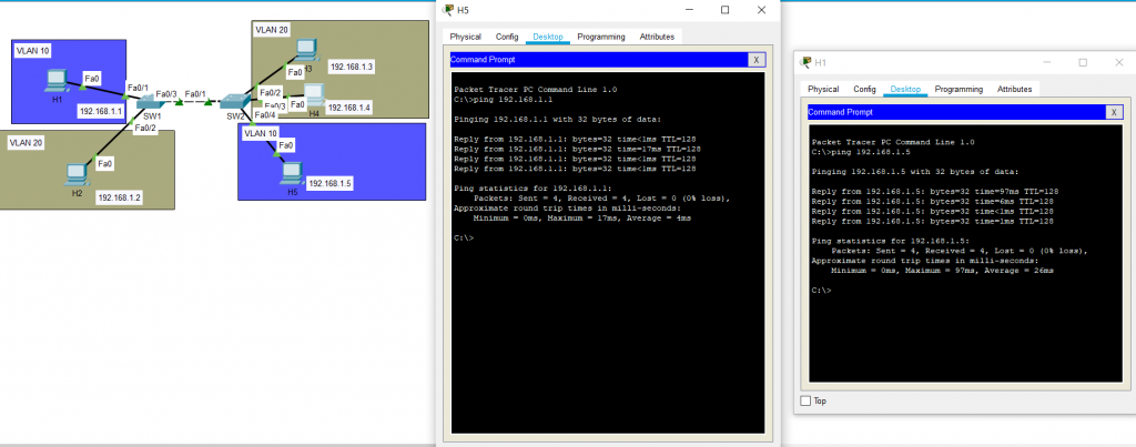 Powyższa topologia składa się z pięciu komputerów (H1, H2, H3, H4, H5) oraz dwóch sieci VLAN (VLAN 10 i VLAN 20). W sieci fizycznej istnieją przełączniki (SW1 i SW2) łączące poszczególne komputery.