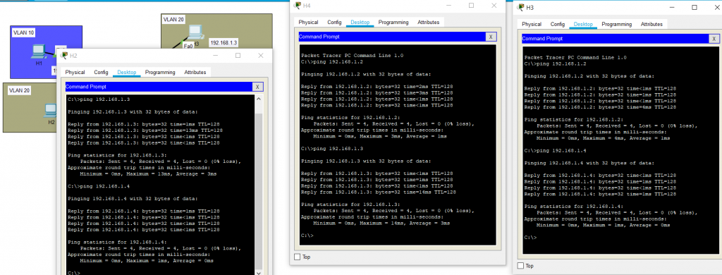 SW2: Switch>en Switch#conf t Enter configuration commands, one per line. End with CNTL/Z. Switch(config)#vlan 10 Switch(config-vlan)#name test1 Switch(config-vlan)#exit Switch(config)#vlan 20 Switch(config-vlan)#name test2 Switch(config-vlan)#exit Switch(config)#interface range fastEthernet 0/2-3 Switch(config-if-range)#switchport mode access Switch(config-if-range)#switchport access vlan 20 Switch(config-if-range)#exit Switch(config)#interface fastEthernet 0/4 Switch(config-if)#switchport mode access Switch(config-if)#switchport access vlan 10 Switch(config-if)#exit Switch(config)#interface fastEthernet 0/1 Switch(config-if)#switchport mode trunk Switch(config-if)#do show vlan brief VLAN Name Status Ports ---- -------------------------------- --------- ------------------------------- 1 default active Fa0/5, Fa0/6, Fa0/7, Fa0/8 Fa0/9, Fa0/10, Fa0/11, Fa0/12 Fa0/13, Fa0/14, Fa0/15, Fa0/16 Fa0/17, Fa0/18, Fa0/19, Fa0/20 Fa0/21, Fa0/22, Fa0/23, Fa0/24 Gig0/1, Gig0/2 10 test1 active Fa0/4 20 test2 active Fa0/2, Fa0/3 1002 fddi-default active 1003 token-ring-default active 1004 fddinet-default active 1005 trnet-default active