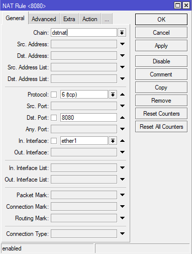Po zalogowaniu do winboxa, przechodzimy do zakładki IP > Firewall > NAT, by utworzyć nowe reguły zawierające następujące informacje: