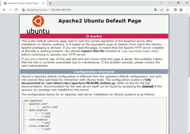 Natomiast gdy wpiszemy 192.168.1.40:8080 zostaniemy przekierowani na stronę serwera w wewnętrznej sieci
