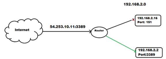 Gdy klient wyśle żądanie na port 20, to router przekieruje go do serwera plików, a jeśli klient będzie chciał zdalnie połączyć się z komputerem to wyśle żądanie przez port 3389.
