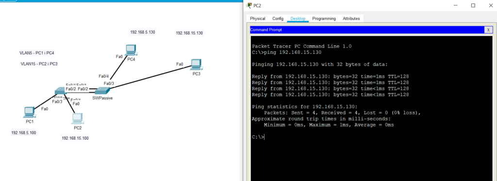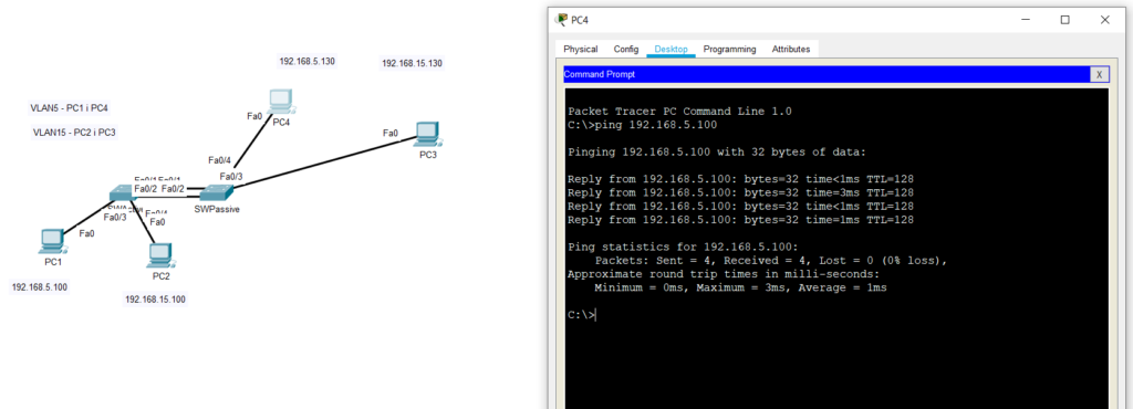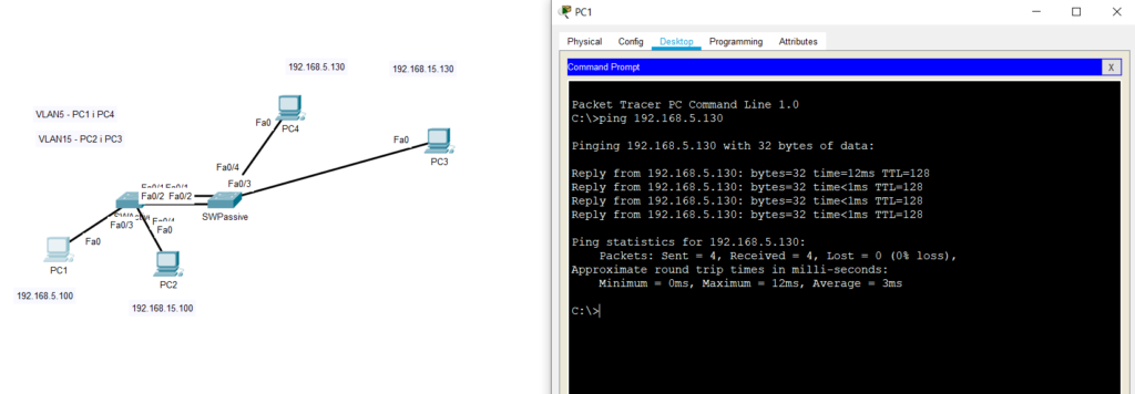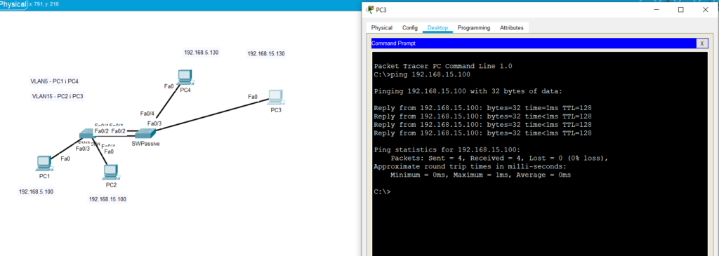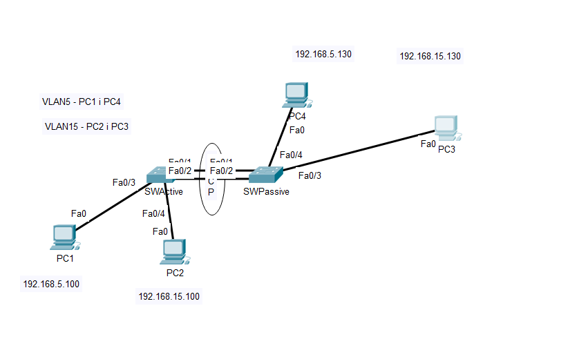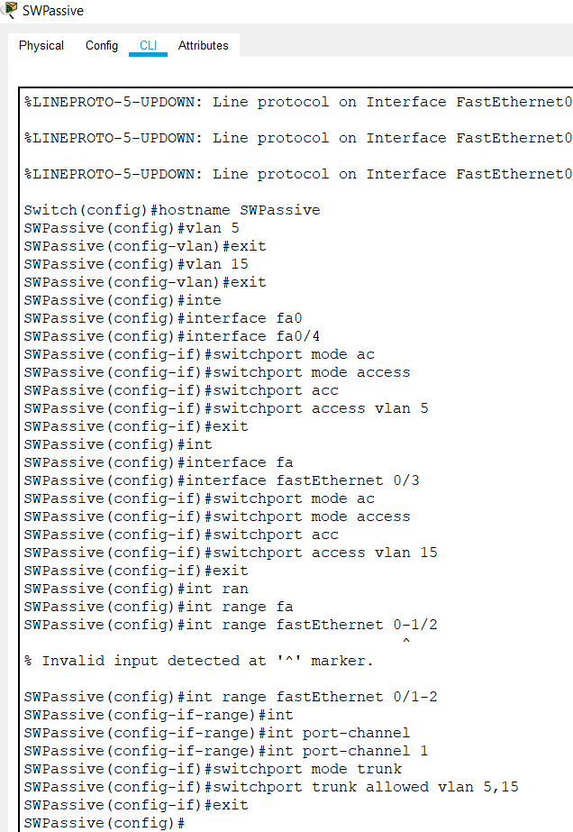 Switch>en Switch#conf t Enter configuration commands, one per line. End with CNTL/Z. Switch(config)# %LINEPROTO-5-UPDOWN: Line protocol on Interface FastEthernet0/2, changed state to down %LINEPROTO-5-UPDOWN: Line protocol on Interface FastEthernet0/2, changed state to up %LINEPROTO-5-UPDOWN: Line protocol on Interface FastEthernet0/1, changed state to down %LINEPROTO-5-UPDOWN: Line protocol on Interface FastEthernet0/1, changed state to up Switch(config)#hostname SWPassive SWPassive(config)#vlan 5 /wprowadzenie vlanu z nr 5 SWPassive(config-vlan)#exit SWPassive(config)#vlan 15 /wprowadzenie vlanu z nr 5 SWPassive(config-vlan)#exit SWPassive(config)#inte SWPassive(config)#interface fa0 SWPassive(config)#interface fa0/4 SWPassive(config-if)#switchport mode ac SWPassive(config-if)#switchport mode access SWPassive(config-if)#switchport acc SWPassive(config-if)#switchport access vlan 5 /ustawienie na interfejsie na urządzeniu końcowym trybu access dla vlanu nr 5 SWPassive(config-if)#exit SWPassive(config)#int SWPassive(config)#interface fa SWPassive(config)#interface fastEthernet 0/3 SWPassive(config-if)#switchport mode ac SWPassive(config-if)#switchport mode access SWPassive(config-if)#switchport acc SWPassive(config-if)#switchport access vlan 15. /ustawienie na interfejsie na urządzeniu końcowym trybu access dla vlanu nr 15 SWPassive(config-if)#exit SWPassive(config)#int ran SWPassive(config)#int range fa SWPassive(config)#int range fastEthernet 0-1/2 SWPassive(config)#int range fastEthernet 0/1-2 SWPassive(config-if-range)#int SWPassive(config-if-range)#int port-channel SWPassive(config-if-range)#int port-channel 1 /ustawienie na interfacach kanalu SWPassive(config-if)#switchport mode trunk SWPassive(config-if)#switchport trunk allowed vlan 5,15 /switchport trunk allowed 5,15/ustawienie dla kanalu trybu trunk –przeplyw pomiędzy siecia vlan 5i15