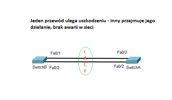 Na rozwiązanie w przypadku takiej awarii służy wykorzystanie nadmiarowej ilości połączeń między Switchami. Komunikacja w dwie strony będzie działać prawidłowo, a co za tym idzie powiększy się przepustowość łącza. Nie chcąc doprowadzić do dużej awarii w niemalże całej sieci warto skorzystać z LAG (Link Aggregation Port) – terminologia CISCO definiuję ją jako Etherchannel.