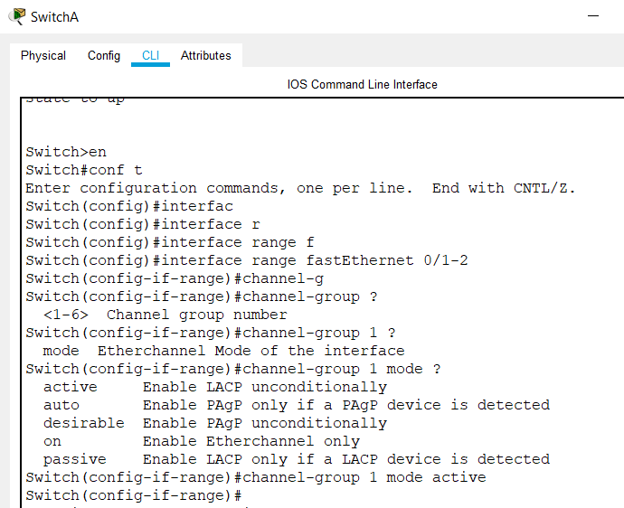 Switch>en Switch#conf t Enter configuration commands, one per line. End with CNTL/Z. Switch(config)#interface range fastEthernet 0/1-2 Switch(config-if-range)#channel-group 1 mode active