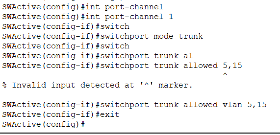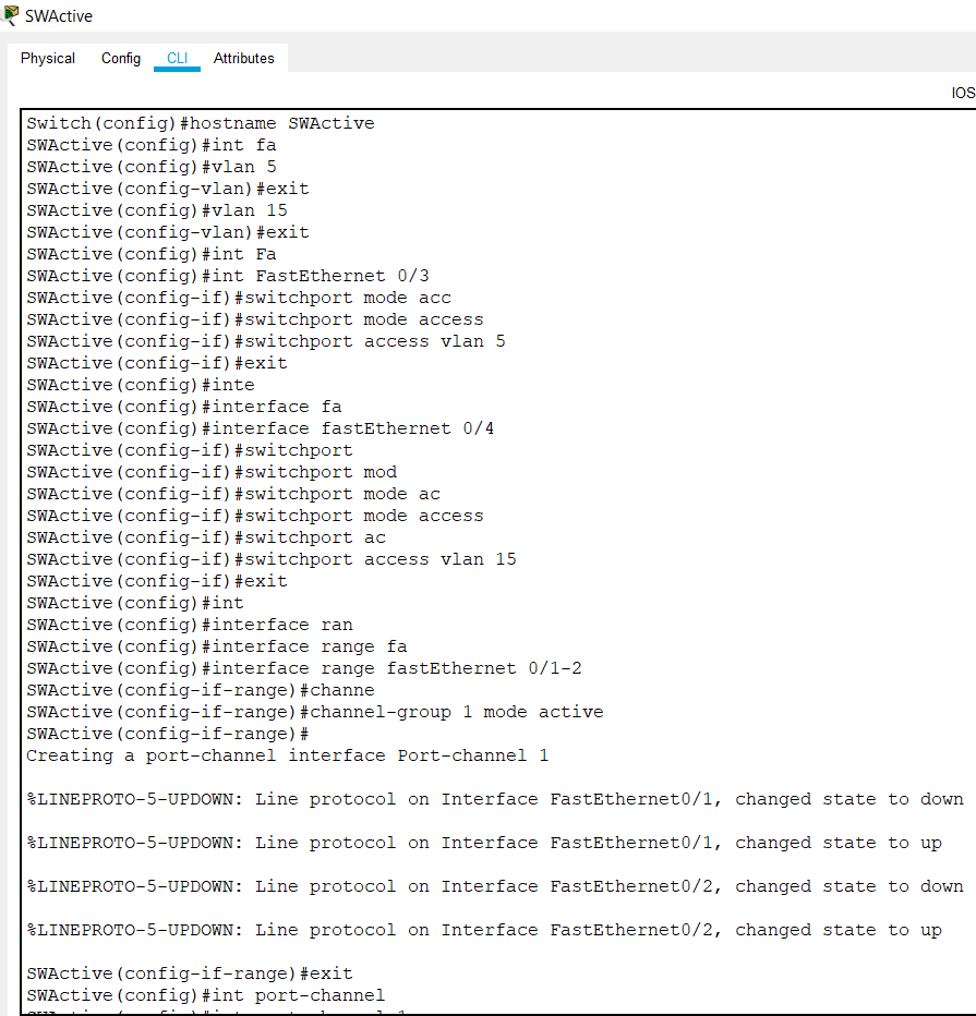 Switch(config)#hostname SWActive /zmiana nazwy switcha SWActive(config)#int fa SWActive(config)#vlan 5 /wprowadzenie vlanu5 SWActive(config-vlan)#exit SWActive(config)#vlan 15 /wprowadzenie vlanu15 SWActive(config-vlan)#exit SWActive(config)#int Fa SWActive(config)#int FastEthernet 0/3 SWActive(config-if)#switchport mode acc SWActive(config-if)#switchport mode access SWActive(config-if)#switchport access vlan 5 /na urządzeniu końcowym ustawienie trybu access dla vlanu 5 SWActive(config-if)#exit SWActive(config)#inte SWActive(config)#interface fa SWActive(config)#interface fastEthernet 0/4 SWActive(config-if)#switchport SWActive(config-if)#switchport mod SWActive(config-if)#switchport mode ac SWActive(config-if)#switchport mode access SWActive(config-if)#switchport ac SWActive(config-if)#switchport access vlan 15 /na urządzeniu końcowym ustawienie trybu access dla vlanu 15 SWActive(config-if)#exit SWActive(config)#int SWActive(config)#interface ran SWActive(config)#interface range fa SWActive(config)#interface range fastEthernet 0/1-2 SWActive(config-if-range)#channe SWActive(config-if-range)#channel-group 1 mode active /ustawienie trybu aktywnego dla dwóch interface SWActive(config-if-range)# Creating a port-channel interface Port-channel 1 %LINEPROTO-5-UPDOWN: Line protocol on Interface FastEthernet0/1, changed state to down %LINEPROTO-5-UPDOWN: Line protocol on Interface FastEthernet0/1, changed state to up %LINEPROTO-5-UPDOWN: Line protocol on Interface FastEthernet0/2, changed state to down %LINEPROTO-5-UPDOWN: Line protocol on Interface FastEthernet0/2, changed state to up SWActive(config-if-range)#exit SWActive(config)#int port-channel SWActive(config)#int port-channel 1 SWActive(config-if)#switch SWActive(config-if)#switchport mode trunk SWActive(config-if)#switch SWActive(config-if)#switchport trunk al SWActive(config-if)#switchport trunk allowed 5,15 /ustawienie dla kanalu trybu trunk –przeplyw pomiędzy siecia vlan 5i15